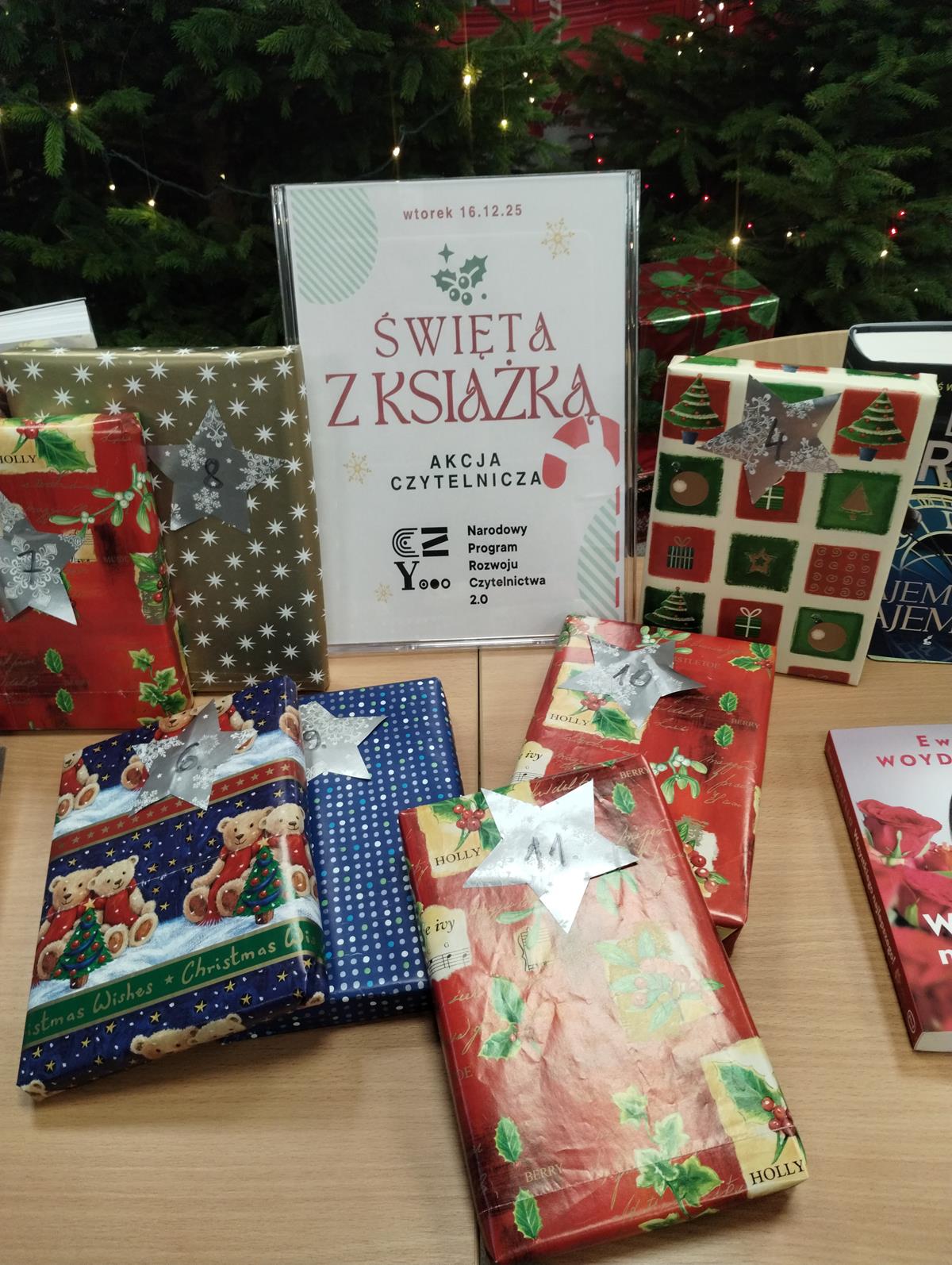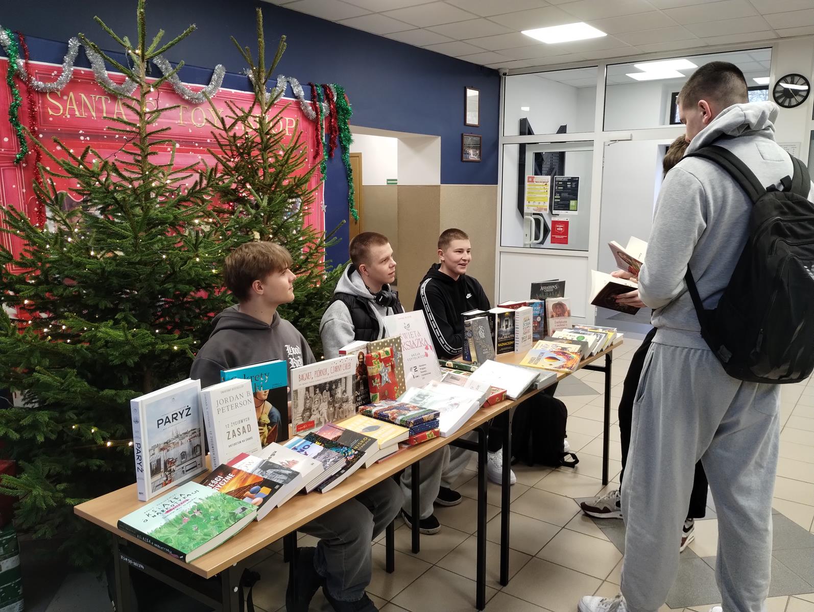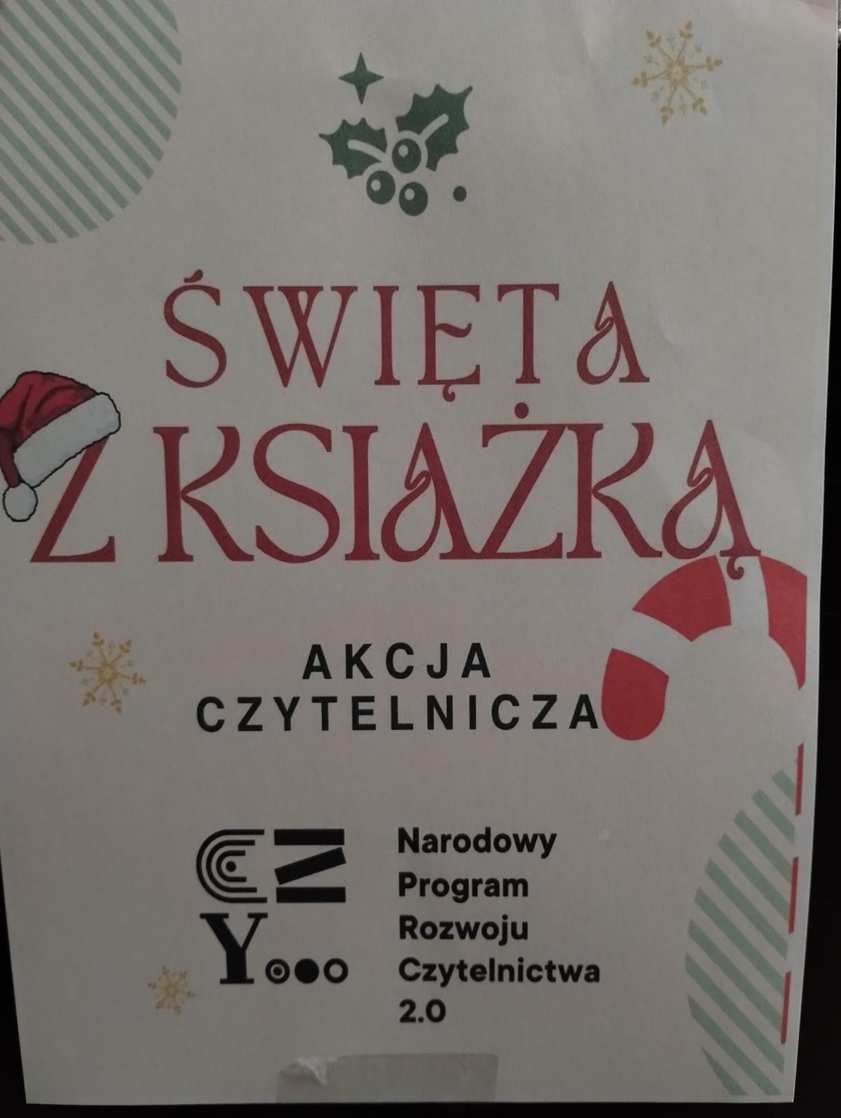 Akcja czytelnicza "Święta z książką" to przypomnienie, że literatura to świetna forma relaksu i wartościowego spędzania czasu podczas przerwy świątecznej. Biblioteczne stanowisko ponownie pojawiło się w głównej części szkoły. Podczas przerw wypożyczano lub losowano najnowsze książki zakupione w ramach Narodowego Programu Rozwoju Czytelnictwa 2.0. Odwiedziły nas również klasy 4 st1 i 2 em (z p. E. Szymańczuk).