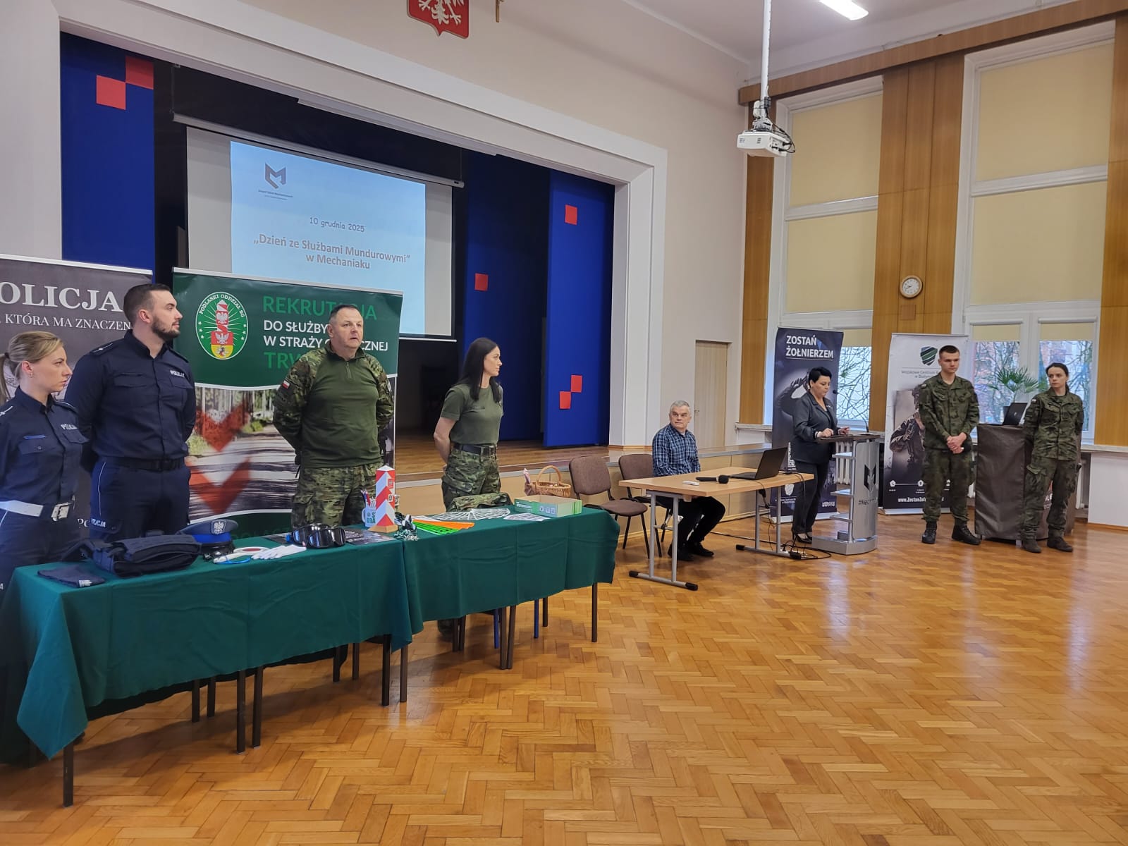 10 grudnia nasza szkoła tętniła wyjątkową atmosferą — to właśnie wtedy młodzież spotkała się z przedstawicielami służb mundurowych. Wydarzenie uroczyście otworzyła Pani Dyrektor serdecznie witając gości i zwracając uwagę na kluczową rolę, jaką służby mundurowe odgrywają w codziennym życiu obywateli i bezpieczeństwie naszego kraju.