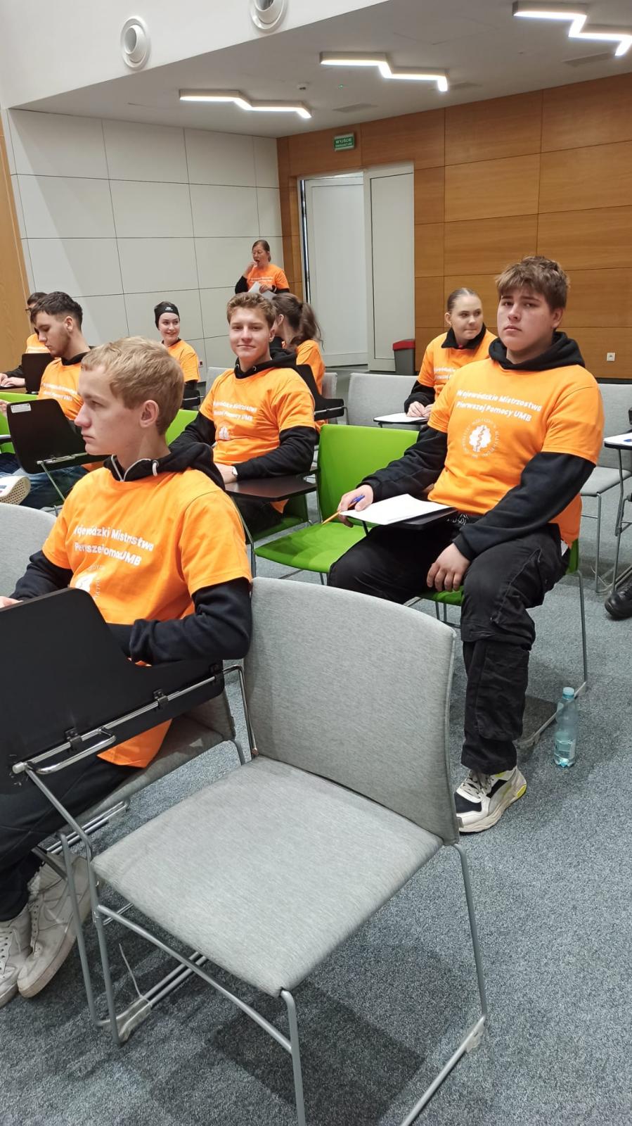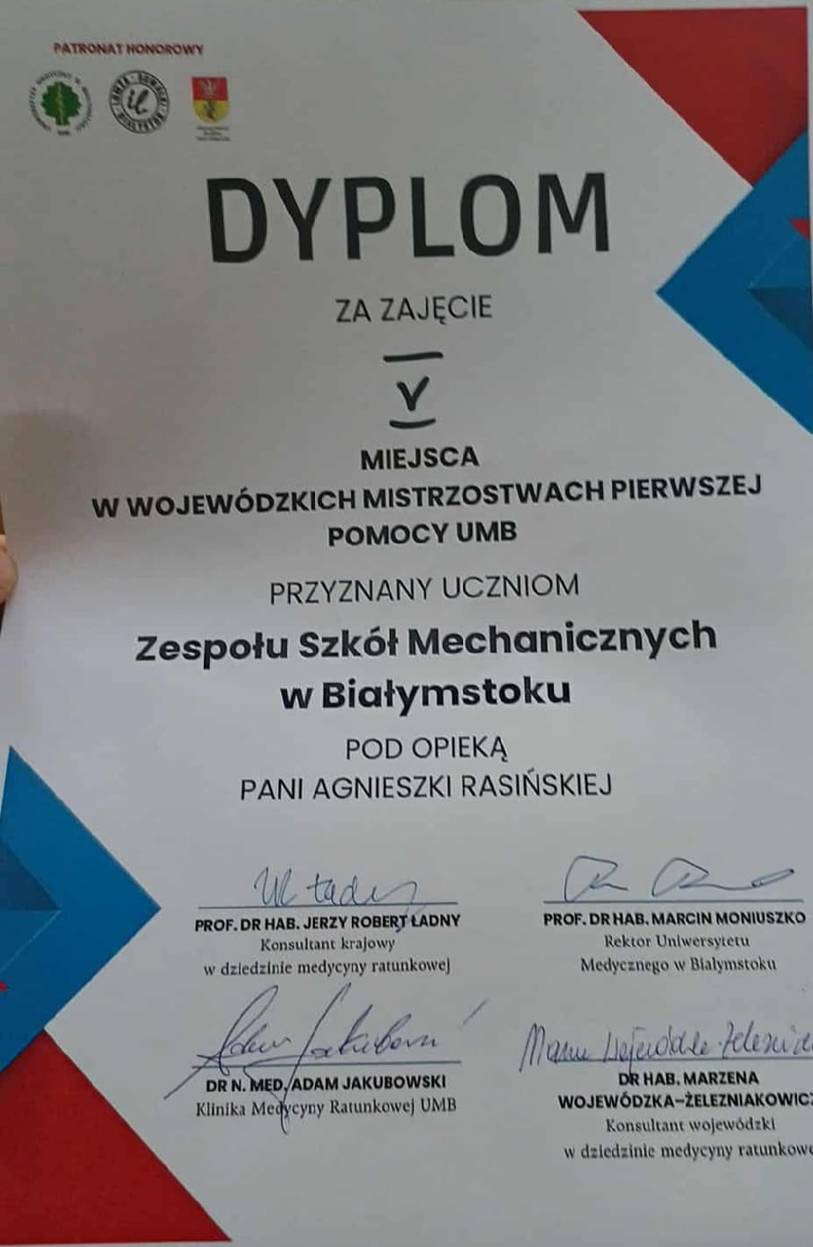 Zespół w składzie: Bartosz Lipiński (5ts1), Kacper Szklarzewski (4tm2) i Paweł Baranowski (2ts1) wywalczyli V miejsce w I Wojewódzkich Mistrzostwach Pierwszej Pomocy Uniwersytetu Medycznego w Białymstoku. Nasi uczniowie byli najlepsi przy najtrudniejszych zadaniach. Gratulujemy reprezentantom naszej szkoły.